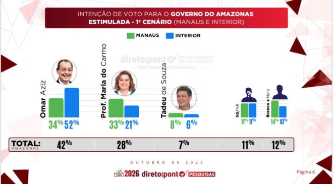 Por outro lado, o senador Omar Aziz (PSD) apresentou queda de 3 pontos, saindo de 45% para 42%. Brancos e nulos somam 12%, e 11% dos entrevistados não souberam responder.