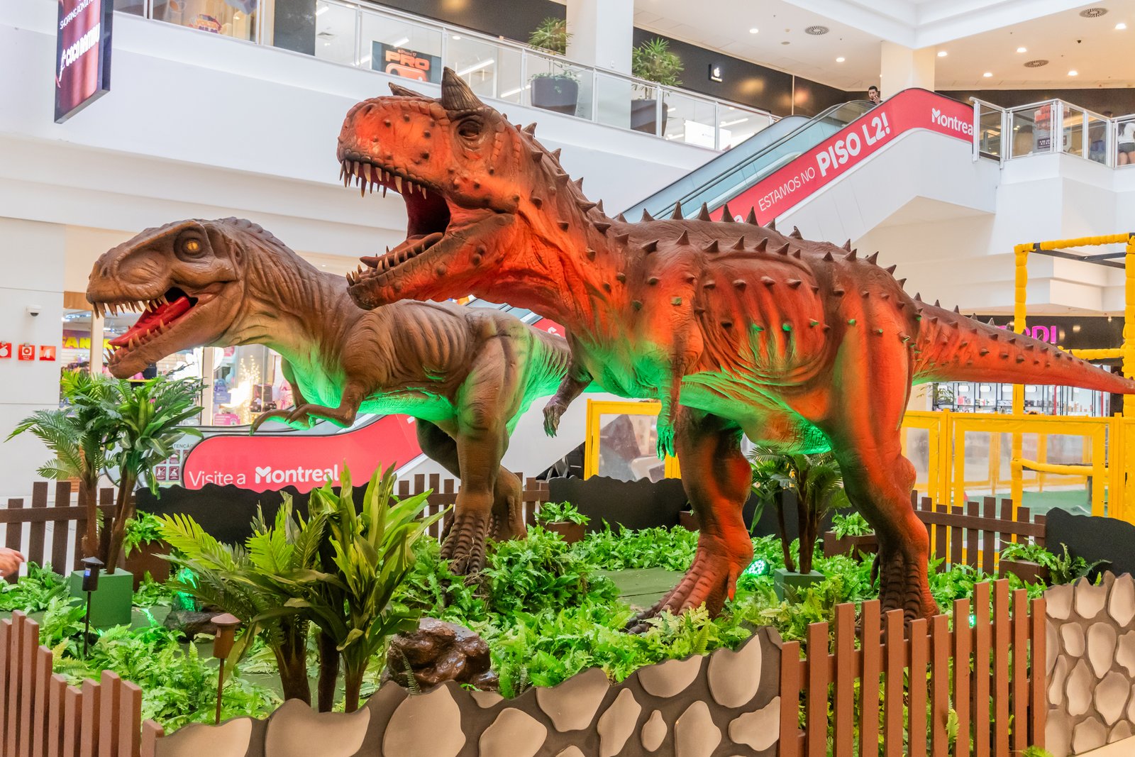 A exposição Mundo Jurássico segue em cartaz no shopping até 1º de março, com mais de dez réplicas de dinossauros em tamanho real, sons, movimentos e atrações interativas, como realidade virtual e espaços para fotos.